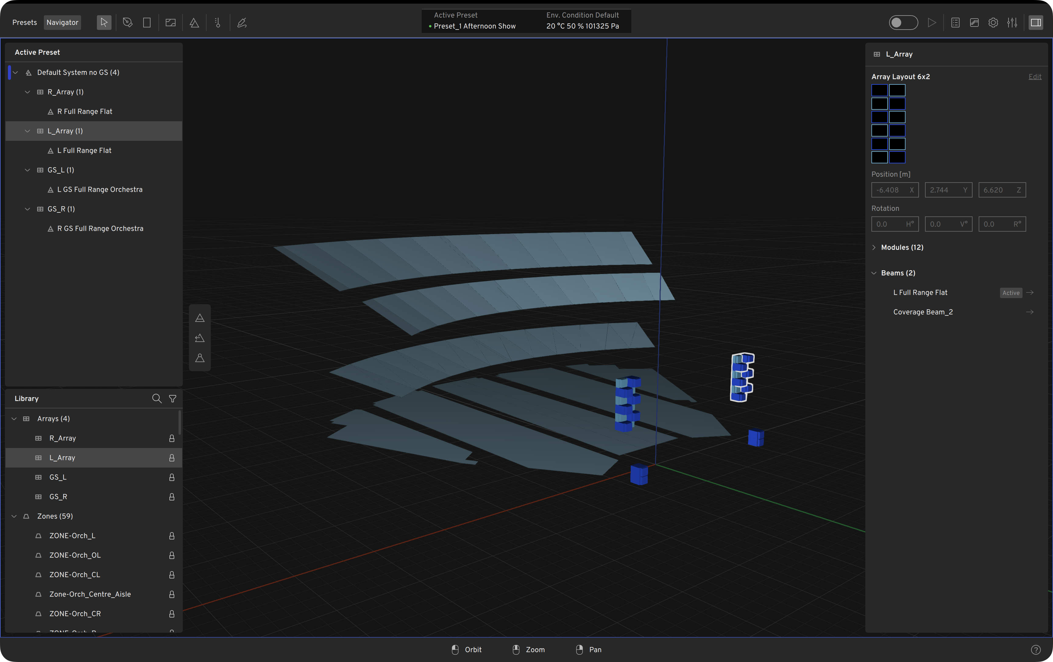 Arrays in HOLOPLOT Plan contain beams with tailored properties that are visualized in the Simulation and can later be deployed to real-world arrays for system configuration and sound reproduction. You can create an array in HOLOPLOT Plan using the Array Builder window (recommended), or design one externally in SketchUp and import it as a .glTF file.