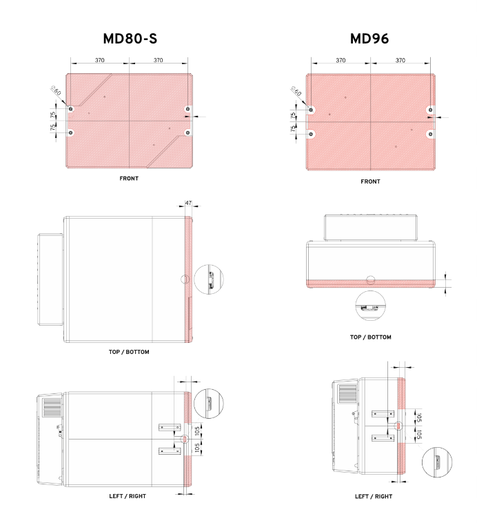 * To safely rig an MD96, at least four of the eight available M10 rigging points must be used together, and at least two on each side of the Audio Module (left and right).&#x20;